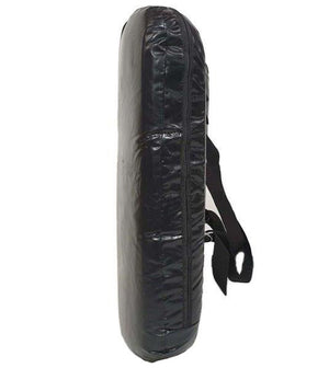 The shield can be used to train multiple attack drills and sequences and held securely in place by dual adjustable nylon straps that are worn over the shoulders and across the back. There is a single extended padded grip handle is located on the inside. The body shield curves around the body offering maximum protection to the wearer.
