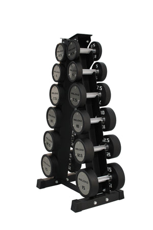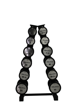 This complete package includes 6 pairs of Reload Premium Round Dumbbells plus a vertical dumbbell rack: